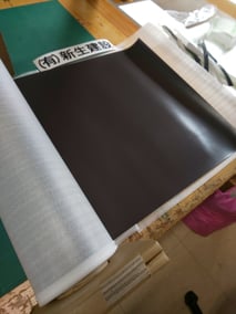 国産マグネットシートの異方性の強力シートは、マグネットシートの素地ですので、下地色のシートを先ず貼ります。