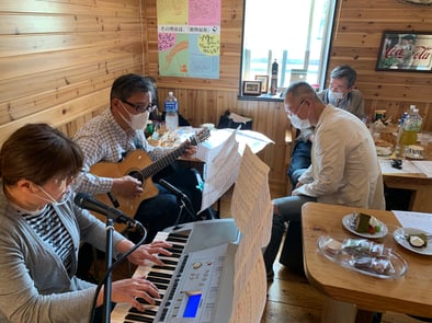 会員8名と その友人4名が集まって パスタやシフォンケーキを楽しみながら 生の歌をみんなで 楽しみました。